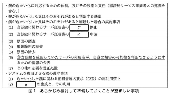 H氏は、今後、再び鍵の危たい化が起きた場合に備えて、あらかじめ検討して準備しておくことが望ましい事項について、Bさんに説明した。その事項を図1に示す。