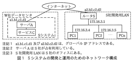 アプリQは、W社データセンタ内のサーバA上で稼働している。アプリQはDBMSサービス(以下、アプリQが連携するDBMSサービスをサービスCという)と連携している。サービスCのデータベースには、効果測定サービスに関するデータ及び入会時に登録された会員情報が保存されている。また、サーバAのCPU負荷やメモリの利用状況などをS社開発用LAN上のPCから遠隔監視するツールをサーバA上で稼働させている。このツールの導入を容易にするために、コンテナ技術を用いている。図1は、Sシステムの開発と運用のためのネットワーク構成である。